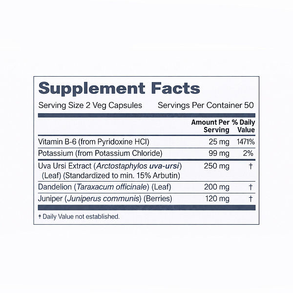 • Экстракт листьев толокнянки — способствует мягкому выведению лишней жидкости и поддерживает здоровье мочевыводящей системы.