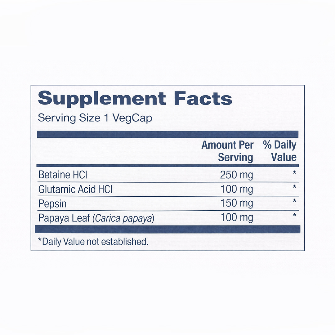 Бетаин гидрохлорид (HCl) с пепсином — это комбинация, предназначенная для поддержки нормального уровня желудочной кислоты и эффективного переваривания пищи, особенно белков. Бетаин HCl способствует повышению кислотности желудочного сока, а пепсин — фермент, который помогает расщеплять белки на аминокислоты. Продукт особенно полезен при сниженной кислотности желудка, ощущении тяжести после еды и недостаточном переваривании пищи. Он способствует лучшему усвоению питательных веществ, включая белки, минералы и витамин B12, и поддерживает здоровье желудочно-кишечного тракта.