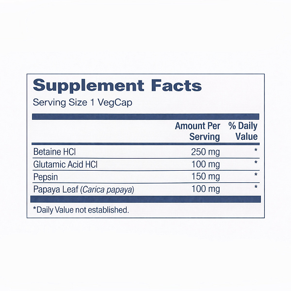 Бетаин гидрохлорид создаёт оптимальную кислотную среду, пепсин эффективно расщепляет белки, а растительные и аминокислотные компоненты дополняют действие комплекса, обеспечивая полноценную поддержку пищеварения.