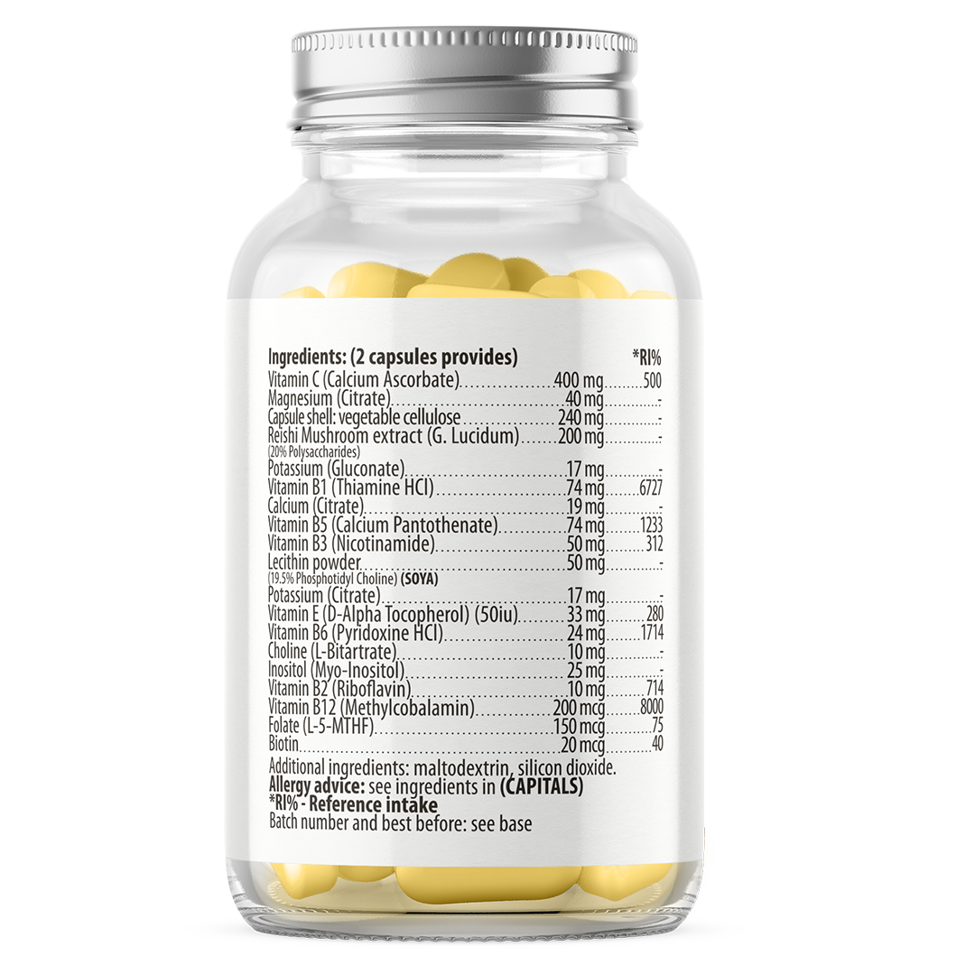 Витамин C, Витамин B12, Витамин E, Биотин, Витамин B1, Витамин B2, Витамин B6, Инозитол, Витамин B3, Холин, Витамин B5, Фолат, Экстракт гриба рейши, Лецитиновый порошок, Магний (цитрат), Калий (глюконат), Калий (цитрат).