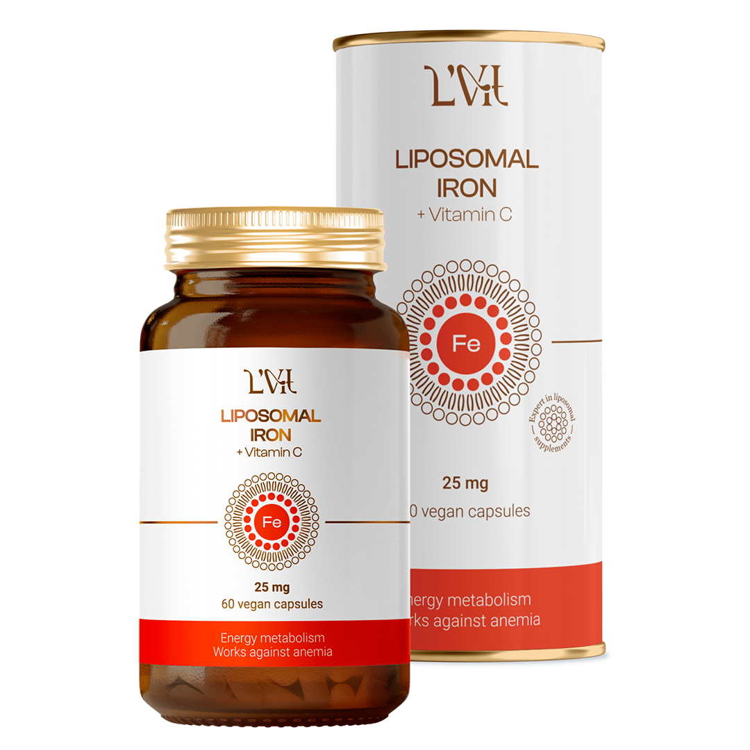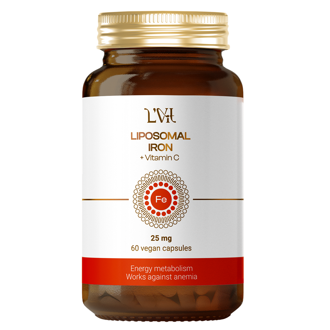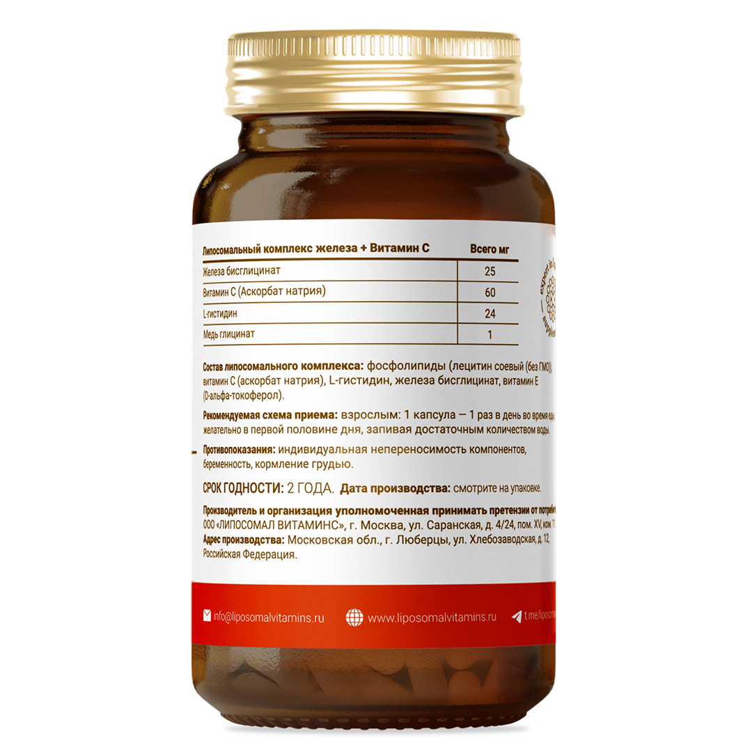 Липосомальное Железо + Витамин С представляет собой щадящую липосомальную форму железа (бисглицинат) с витамином С, заключенную в липосомы – микроскопические пузырьки из фосфолипидов. Эта форма обеспечивает биодоступность до 100%, не раздражает ЖКТ, не вызывает тошноты и запоров. Витамин С усиливает всасывание железа и защищает его от окисления. Железо необходимо для синтеза гемоглобина, транспорта кислорода, энергии и иммунитета. Дефицит железа проявляется анемией, хронической усталостью, слабостью, выпадением волос, бледностью, одышкой. Регулярный прием липосомального железа способствует повышению гемоглобина и ферритина, устранению слабости, улучшению энергии, иммунитета и восстановлению после кровопотерь. Ликвидирует нарушения со стороны нервной системы: зябкости рук и ног, мышечной слабости и головокружения. Повышает работоспособность и концентрацию внимания. Повышает устойчивость к стрессу и физическим нагрузкам. Железо в липосомах быстрее всасывается и действует эффективнее, чем традиционные формы БАД.