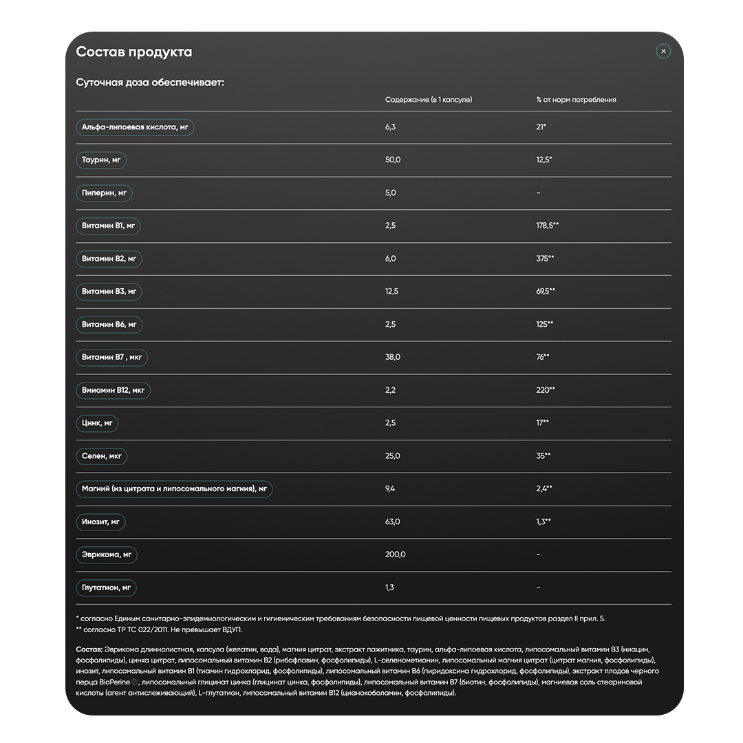 | Магний (из цитрата и липосомального магния) | 9,4 мг | |