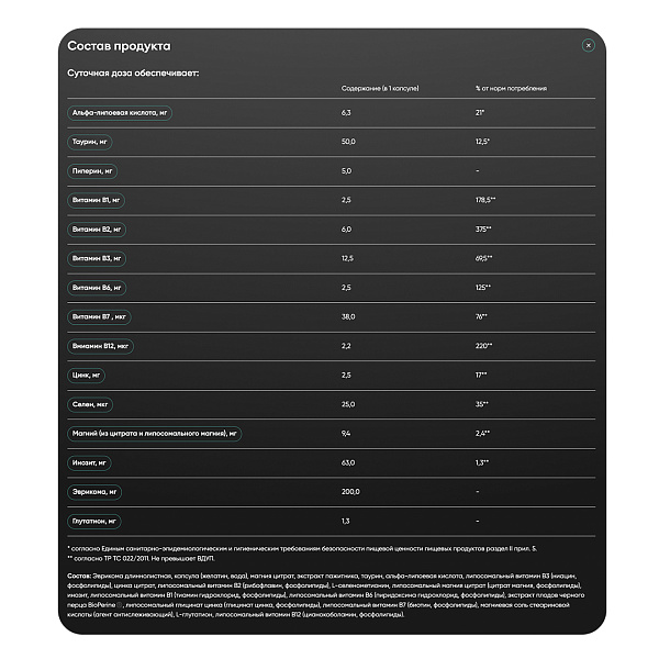 | Другие компоненты | Капсула (желатин, вода), магниевая соль стеариновой кислоты (агент антислеживающий). | |