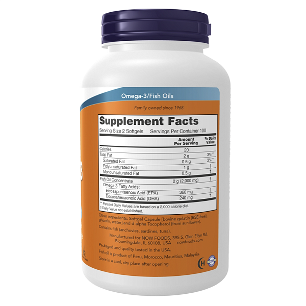 Омега-3 рыбий жир от NOW Foods содержит концентрат, обогащённый эйкозапентаеновой (ЭПК) и докозагексаеновой (ДГК) кислотами — жизненно важными полиненасыщенными жирными кислотами, которые организм не может синтезировать самостоятельно.