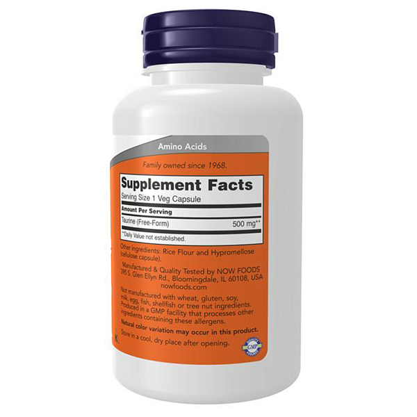 Таурин от NOW Foods содержит таурин в свободной форме — аминокислоту, играющую ключевую роль в регуляции клеточных процессов.