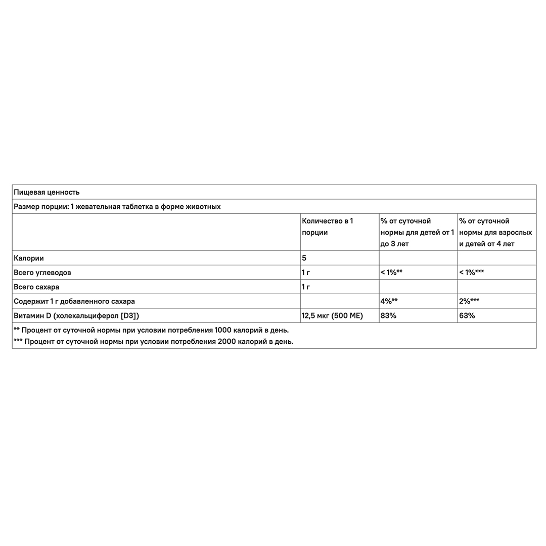 | Витамин D | холекальциферол (D3) | 12,5 мкг (500 МЕ) |