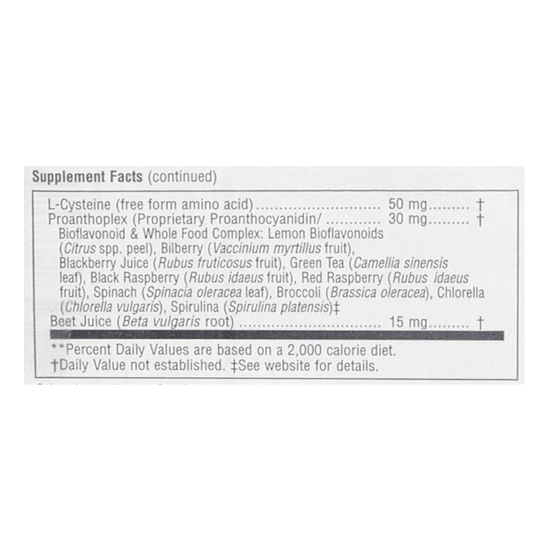 | Proanthoplex | проантоцианидины и биофлавоноиды из лимона, черники, ежевики, зеленого чая, малины, шпината, брокколи, хлореллы, спирулины | 30 мг |