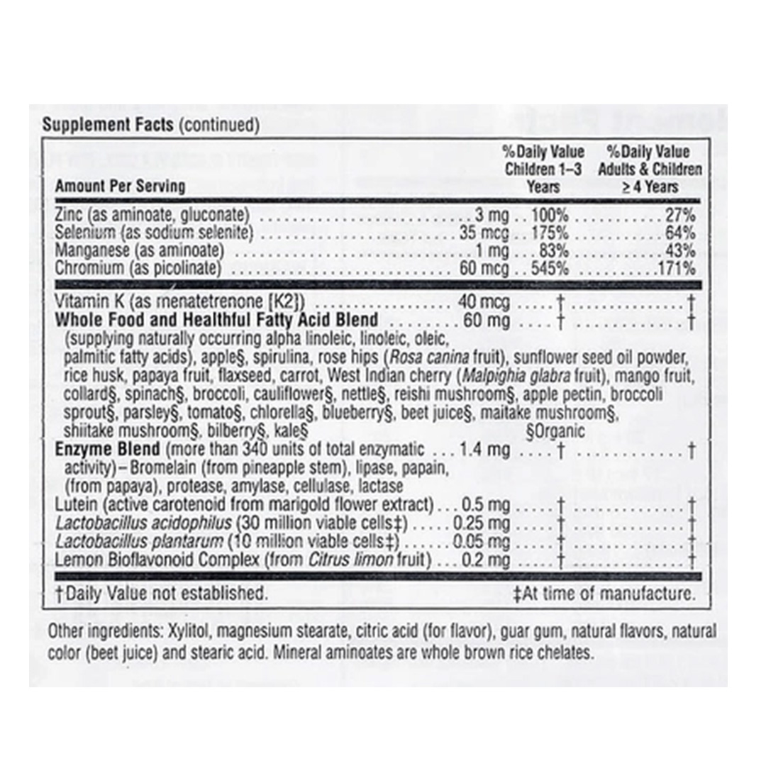| Прочие ингредиенты | ксилит, стеарат магния, лимонная кислота, гуаровая камедь, натуральные ароматизаторы, натуральный краситель (сок свеклы), стеариновая кислота, минеральные аминоаты и хелаты из цельного коричневого риса. | |