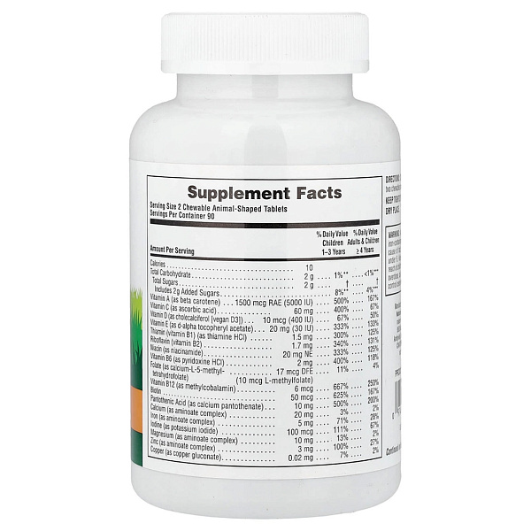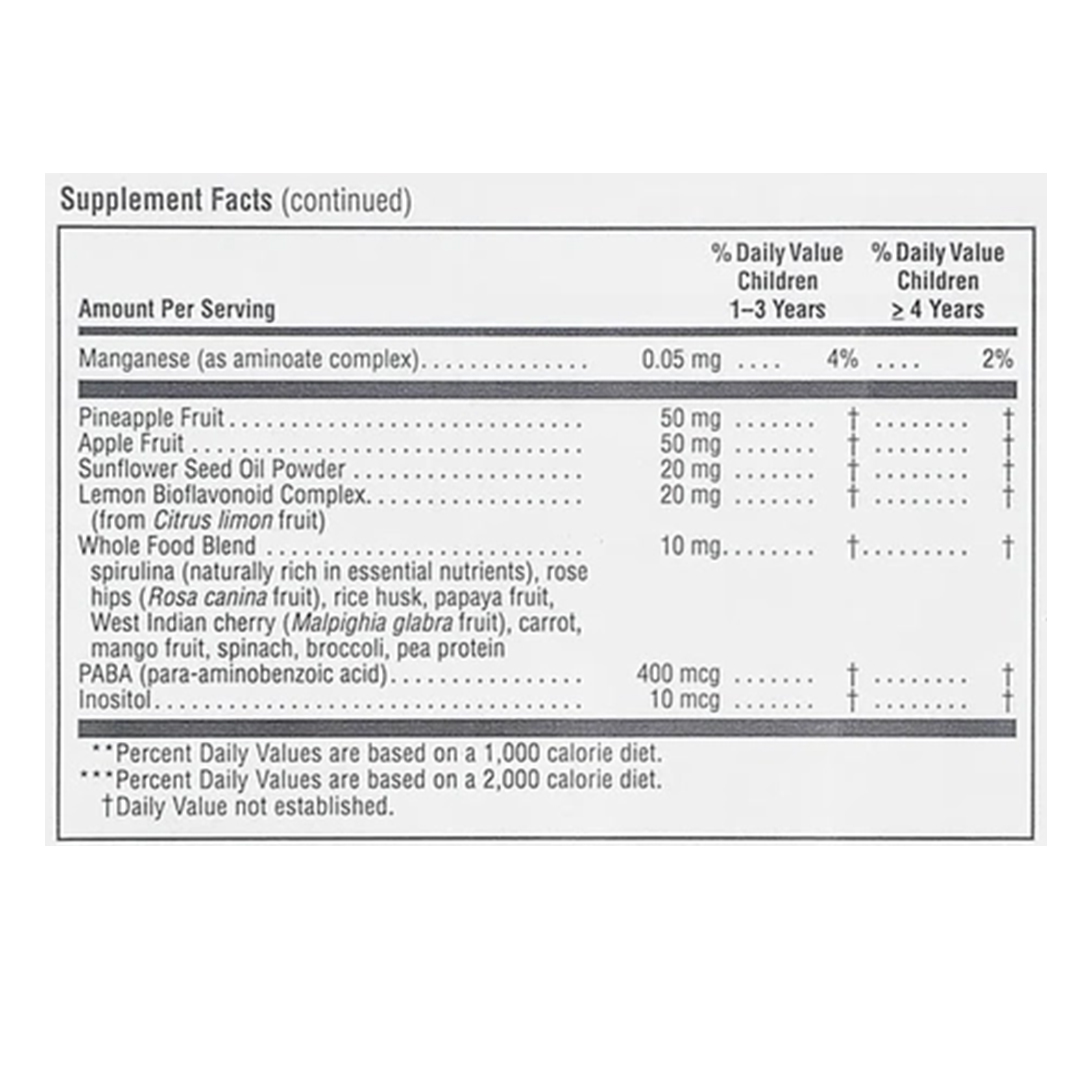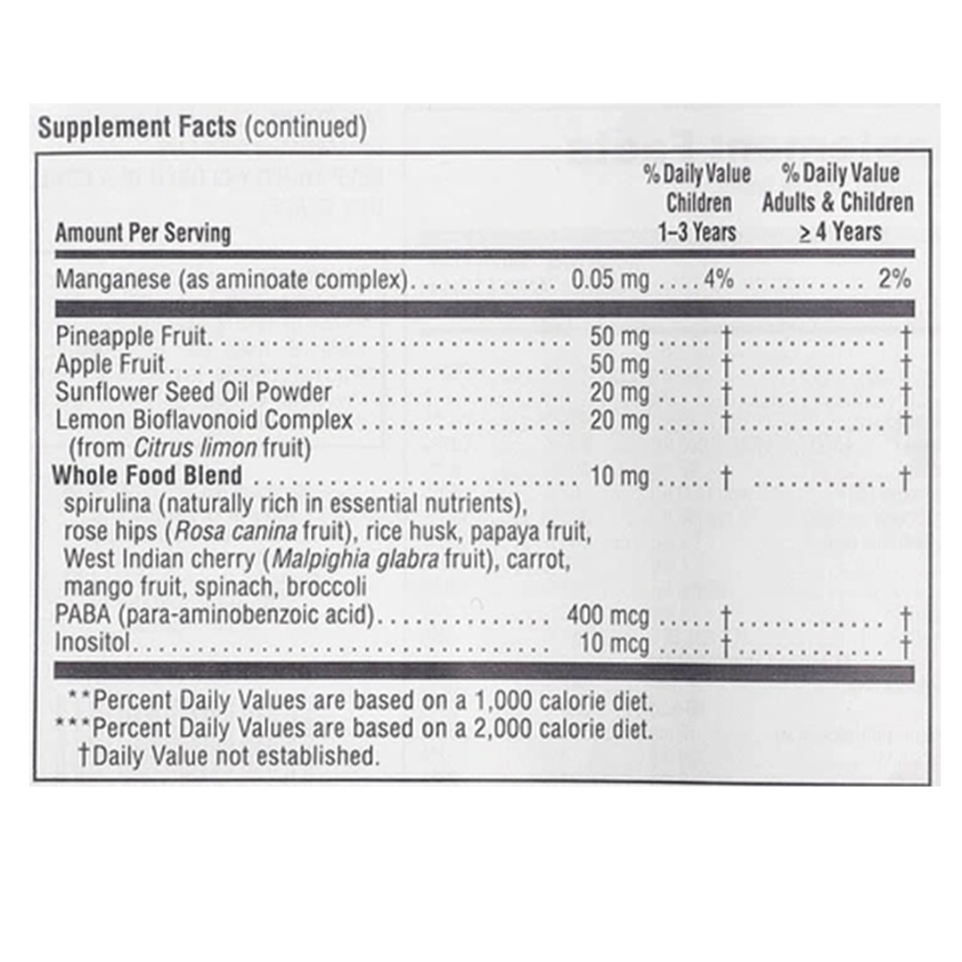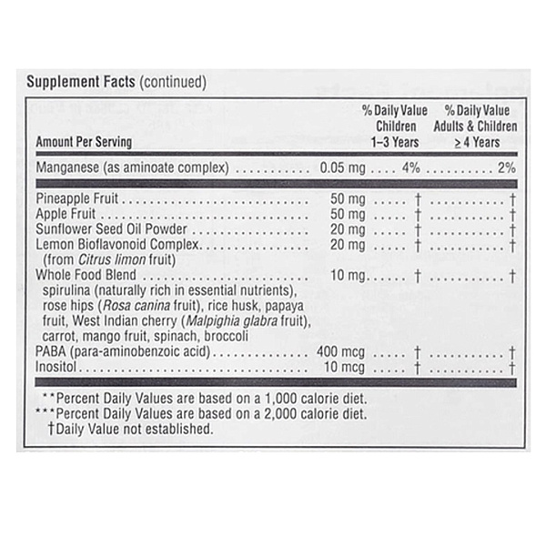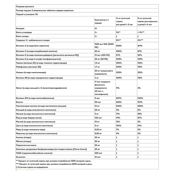 | Прочие ингредиенты | натуральные подсластители (тростниковый сахар без ГМО, фруктоза), микрокристаллическая и растительная целлюлоза, лимонная кислота, гуаровая камедь, натуральные красители (аннато, сок свёклы, куркумин), карбонат кальция, фумарат железа, оксид магния, стеарат магния, спирулина, плоды шиповника, рисовые отруби, папайя, ацерола, морковь, брокколи, манго, холина битартрат. | |