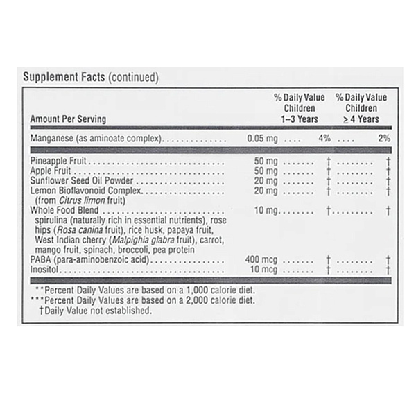 Комплекс витаминов, минералов и цельнопищевых экстрактов поддерживает обмен веществ, кроветворение и энергетический уровень. Недостаток нутриентов снижает активность и жизненный тонус ребёнка. Продукт восполняет дефицит витаминов и минералов. В результате ребёнок получает больше энергии и устойчивость к стрессам.